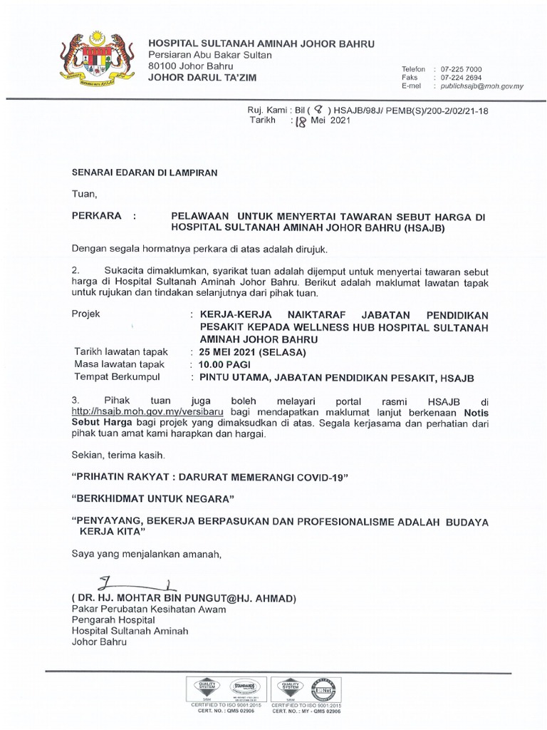 HSAJBKEWSH1062022 dan dimasukkan ke Peti Sebut Harga jabatan. Department of Otorhinolaryngology Hospital Sultanah Aminah Jalan Persiaran Abu Bakar Sultan 80100 Johor Bahru Johor Malaysia. Tarikh Tutup Sebut Harga.